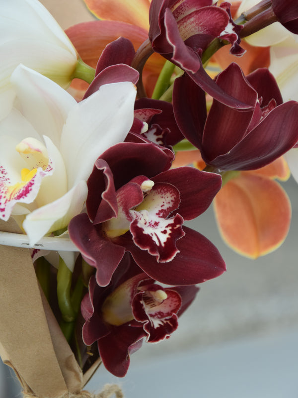 A curated selection of exquisite cymbidium stems, handpicked in a harmonious blend of colours available on the day of your order.